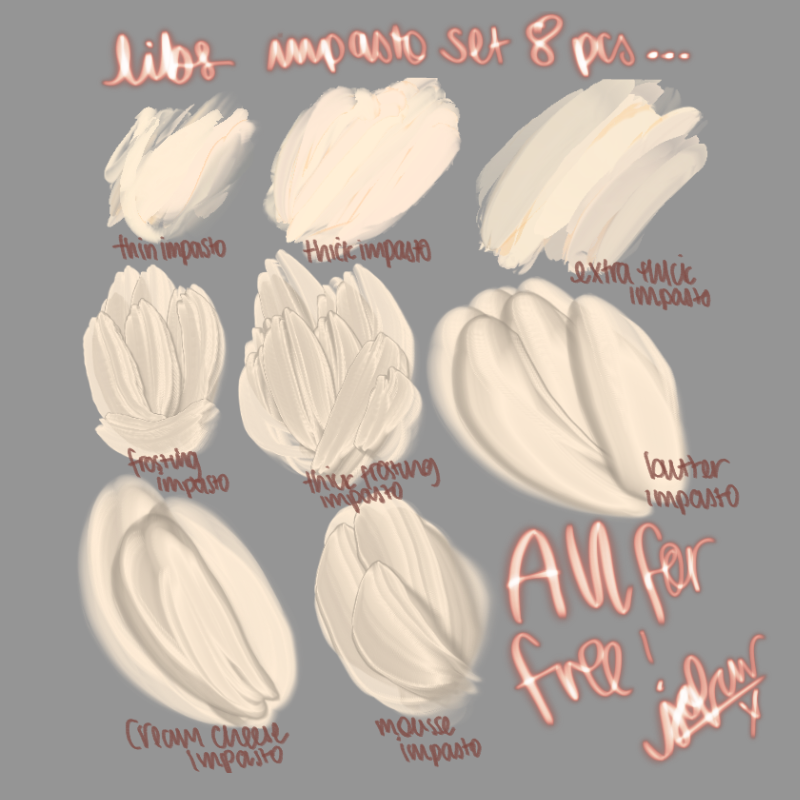This brush pack contains 8 brushes which gives a realistic effect of impasto & a frosting looking texture to add to your artworks. Please don’t claim the brushes as your own as these brushes are custom made, thank you. Thank you all for the support of purchasing my brushes💕